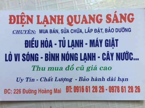 Trung tâm điện lạnh Quang Sáng Chuyên Sửa tủ lạnh tại hoàng mai ĐIỆN LẠNH QUANG SÁNG với nhiều năm kinh nghiệm trong lĩnh vực mua bán các mặt hàng điện tử điện...